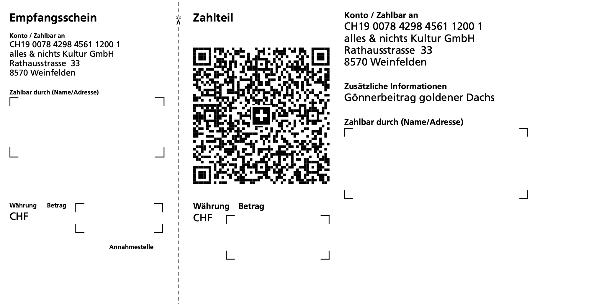 E-Mailinfo@goldenerdachs.ch AdresseSchulstrasse 1, 8570 Weinfelden Telefon+41 71 622 40 44 alles & nichts Kultur GmbHUID: CHE-463.094.204IBAN: CH19 0078 4298 4561 1200 1Zum QR-Einzahlungsschein